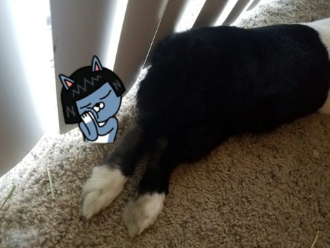 뒷다리 쭉 뻗고 편히 누워있는 자세.