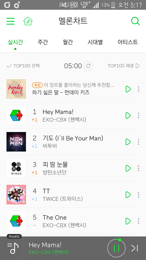 5시 멜론 차트 첸백시 1위