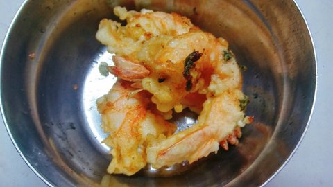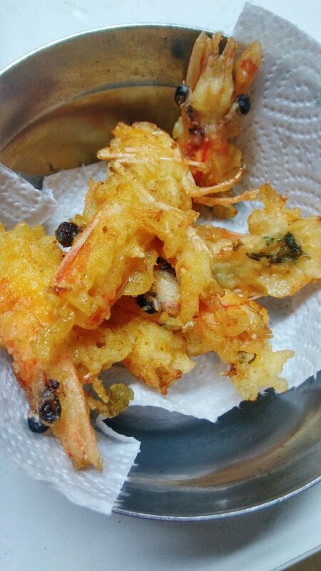 음... 원래는 통으로 튀겨내고 싶었는데........ 몸통 부분의 껍질을 까다보니 머리가 다 분리되더라고요........ㅎㅎ 눙물ㅠㅠ 그래서 머리도 따로 튀겼어요! 반죽에는 키우던 바질 잎도 살짝 넣어줬답니다 ㅎㅎ 향은 별로 안 났지만.. 예쁘면 됐죠 뭐!!ㅋㅋㅋ