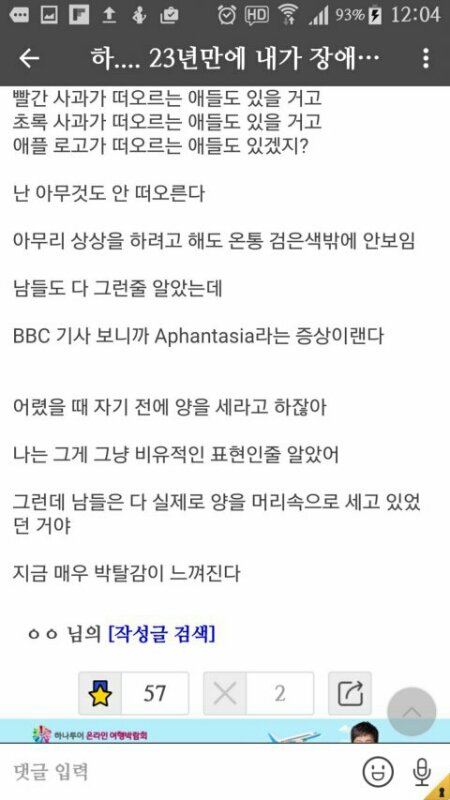 아판타시아라는 질병은 시각실인증임. 전세계 2.5%가 이 병을 앓고 있는데.. 문제는 시각 문제가 아니라 눈으로 본걸 형상화 하는데 있음. 글쓴이처럼 양을 세라고 하면 머리속에서 양 이미지를 떠올리는데, 털이 복슬복슬한 덩어리나, 메에에 울고 있는 그런 동물이라든가 이런식으로..하지만 이 병은 갖고 있는 사람은 양에 대한 이미지가 죽어도 안떠오름. 아예 진짜 눈앞에 아무것도 없는 거임. 지금 댓글다는 애들이 착각하는게 사진처럼 이미지가 꽉 박혀야되느냐 하는데 그게 아니고, 어렴풋하지만 내가 인지하고 있는 사물에 대한 이미지가 머릿속에 떠올려지면 이상 없는거임. 이 병 가진 사람들은 애초에 이 이미지 자체가 죽어도 안 떠오름. 기억력과 별개로 사물에 대한 이미지가 형상화가 안됨. 눈 감고 오렌지가 어떻게 생겼죠? 하고 물어보면 이사람들은 대답을 못함. 눈 앞에 물건이 없기 때문에..쉽게 자기가 이 장애가 있는지 없는 지 알려면 눈감고 그냥 아무 사물이나 떠올리고 스스로 그 사물이 어떻게 생겼는지 입밖으로 내보셈. 그게 안되면 저 장애가 있을 확률이 높음