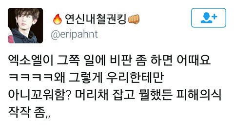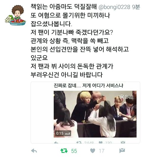 누가 봐도 뷔가 이상한데? 지들끼리도 너무 했다 싶으니까 처음 트윗 올린 거 아니야? 그래놓고 중간에 리트윗한 엑소팬 두들겨패는 중?ㅋㅋㅋ