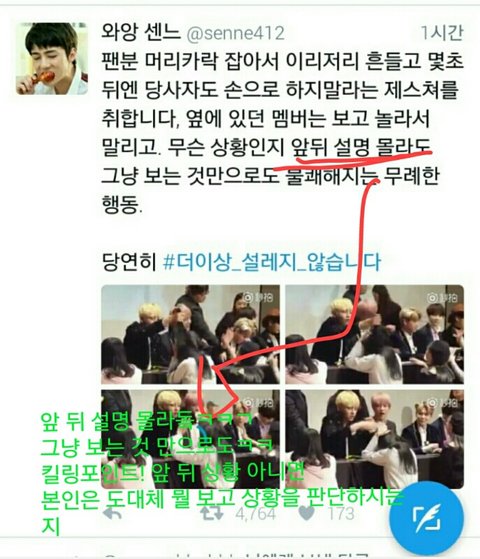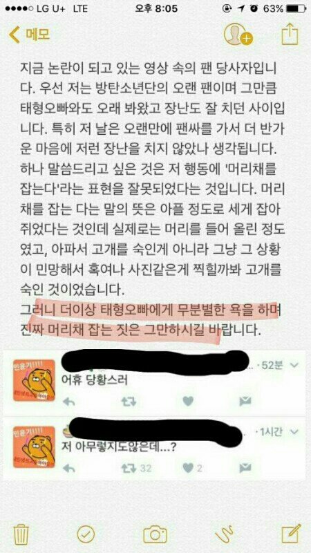 아래 움짤과 함께 '머리채'를 잡고 흔든다며 앞으로는 저런 행동 조심해 줬으면 좋겠다면서 잘못 이라 주장을 함