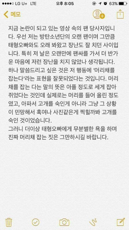 제발 앞 뒤 다 잘라먹지좀 말아줘,, 이런 글만 대체 몇개야,, 태형이가 처음에 얼굴 감싸주기더 하고 머리 만지면서 장난친거고 마지막에 웃으면서 머리 정돈 해주고 그랬어 문론 저 팬분도 장난이라고 생각하시거 계셔 근데 왜 너희가 난리야