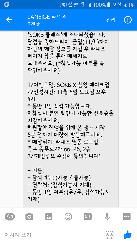 10월 28일에 라네즈 페북에 so.kb 뷰티클래스 음영메이크업 신청 이벤트가 올라와서 댓글 응모함. 까묵고있다가 11월 3일 금욜에 라네즈에서 당첨 축하 메시지가 옴.