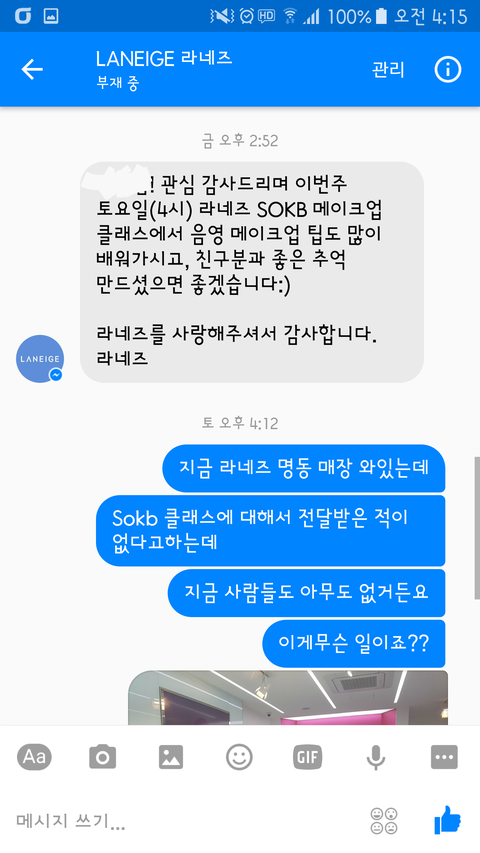 어쨌든 직원한테 페북 이벤트 때매 왔다니까 안믿길래 메시지 다보여쥼. 자기도 상황은 파악하는데 전 전달받은게 없는데요~~ 저도 매우 당황스럽네요;; 라는 식으로 책임회피 시전. 우선 확인해본다기에 앉아서 기다리는데 너무 기분나쁜거임