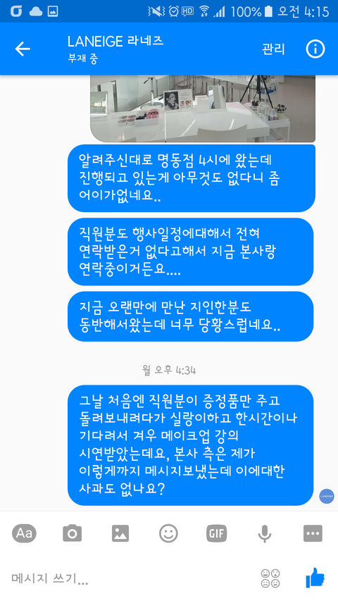 메컵 아티스트가 "서로" 기분은 안좋지만 분위기 좋게 갈게요~~이러는데 아니 자기도 라네즈 직원 일원으로서 책임을 져야하는 게 아닌가? 피해본 고객들에게 말할 태도는 아니잖아.