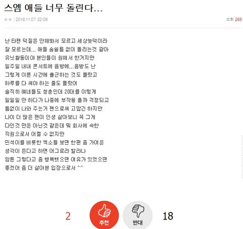 어제 밤에 민석이랑 민석이팬들 아주 오랫동안 집착하면서 괴롭혀온 자아분열 정신병자란 소리가 절로 나오는 그 어그로 글삭했네. 아침에 자고 일어나보니 팬코를 구구절절이 하면서 글 남겨놨더라고(추천도 본인 아이디로 추천하는 앤거 오랫동안 시달려온 팬들이라면 알거라고 생각해) 그글에 지속적인 어그로팬코악질악개짓을 이미 눈치챈 어떤 웅녀가 댓글을 썼고 웅녀들의 추천을 받아 베플이 만들어졌더라고