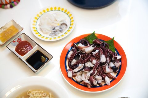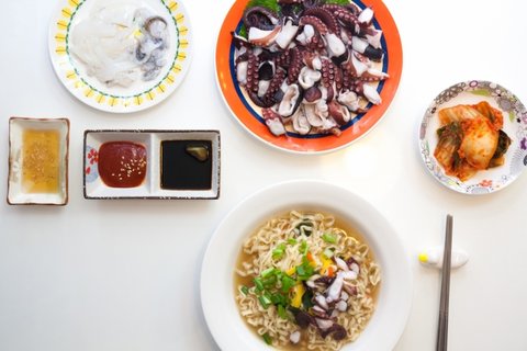 문어 멸치칼국수 , 문어숙회 , 무늬오징어회~