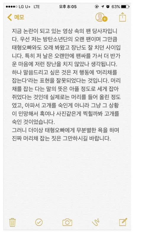 볼 감싸는 것이 보임? 저 팬이 방탄이랑 조금 오래 된 팬이라 그렇다고 했음 그리고 저 팬이 반말 쓰길래 태형이가 반말 하지 말라고 장난으로 머리 잡았음 그리고 볼도 감싸 줬음 장난이 팩트임 구분 좀 하고 말 해라 진짜 그리고 ㅂㅈㅁ 님이 수업 7시에 들어가서 못 봤다는 건 어쩔건데 ㅋㅋㅋㅋㅋ ㅂㅈㅁ님 잘못만 없다고 짹에 댓글이 수두룩 함 그러면서 9시에 확인 했다고 했음서 7시 29분에 글 올리시고 애초에 방탄을 별로 안 좋아 하시는 분이였음 ㅋㅋㅋㅋㅋㅋ 그리고 태형이 인성 좋고 별명이 김스치면 인연임 꼬우면 영상 찾아 보고 가족들이랑 아미를 엄청 챙김 이게 팩트임 태형이 인성이 ㅂㄹ네 뭐네 그래 ㅋㅋㅋㅋㅋㅋㅋ 머리채 잡은 "배속"한 짤만 보지 말고 제발 볼 감싸고 꿀이 떨어질 듯한 태형이 얼굴도 좀 봐 주셈 제발 잘 알고 뭐라고 하셈 ㅈㅂ ㅜㅜ