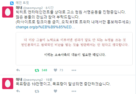 +)링크 올려도 된다고 하셔서 링크 추가할게https://www.change.org/p/%EB%B9%85%ED%9E%88%ED%8A%B8-%EC%97%94%ED%84%B0%ED%85%8C%EC%9D%B8%EB%A8%BC%ED%8A%B8-%EB%B9%85%ED%9E%88%ED%8A%B8%EC%9D%98-%EC%86%8C%EC%86%8D-%EC%95%84%ED%8B%B0%EC%8A%A4%ED%8A%B8-%EB%B3%B4%ED%98%B8%EB%A5%BC-%EC%9C%84%ED%95%9C-%EC%A0%81%EA%B7%B9%EC%A0%81%EC%9D%B8-%EB%8C%80%EC%9D%91%EC%9D%84-%EC%9A%94%EC%B2%AD%ED%95%A9%EB%8B%88%EB%8B%A4-c65f4fd7-42de-4362-94d3-450e93ef87cc