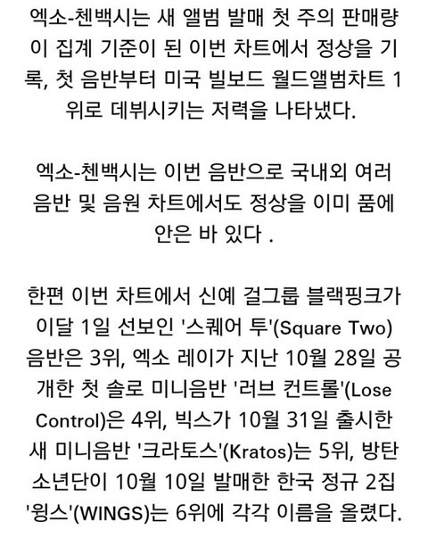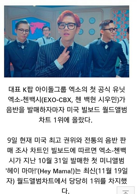 엑소 유닛 첸백시 미 빌보드 월드앨범차트 1위로 데뷔