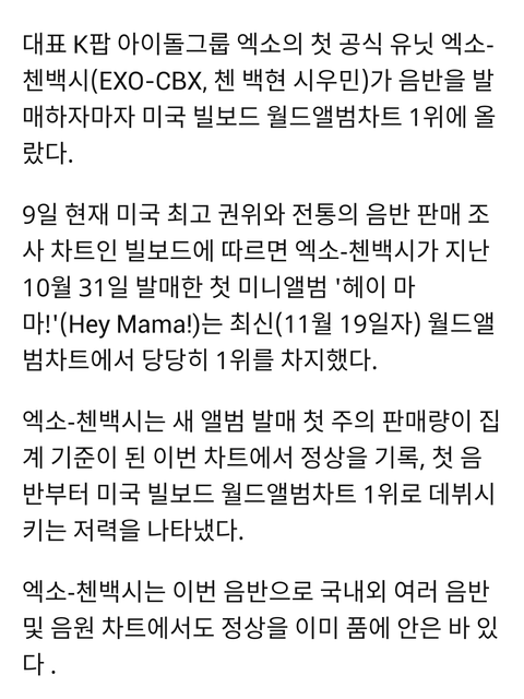 '엑소 첫유닛' 첸백시, 美빌보드 월드앨범차트 1위로 데뷔..저력