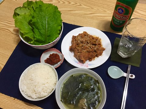 혼밥,혼술 - 제육볶음, 미역국, 상추쌈, 맥주