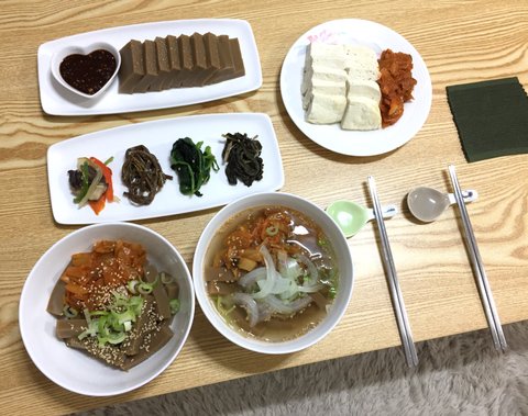 혼밥 - 묵밥, 두부김치, 나물 반찬(버섯, 고사리, 시금치, 취나물)