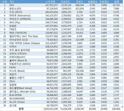 그리고 밑에 차트가 모든 곡을 합친 음원점수임