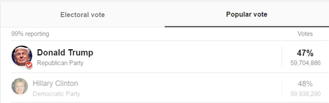 이제 이건 사람들의 투표 결과야. 맨 오른쪽 %를 보나 숫자를 보나 미미하지만 클린턴이 이겼어. 미국의 투표시스템 덕에 이긴거지 트럼프는. 실제 득표율은 클린턴이 더 많아.