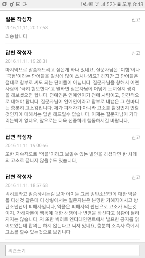 자기의견이 왜욕이냐고하던사람 사과함 박수