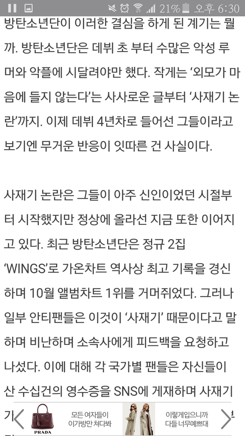 그래도 진짜 그동안 방탄이랑 팬들 관련 일들 제일 잘 정리한 것 같아. 친구만 봐도 울고 불고 지금도 5월 생각만 하면 트라우마에 손 떨린다는 거 옆에서 보면서 내 일 같고 안데 기사가 팬들 답답해하고 억울해했던 부분들 다 제대로 표현해준 것 같다. 정말 방탄도 아미들도 너무 마음고생 많았고 앞으로는 소나무길만 걷기를 바라.