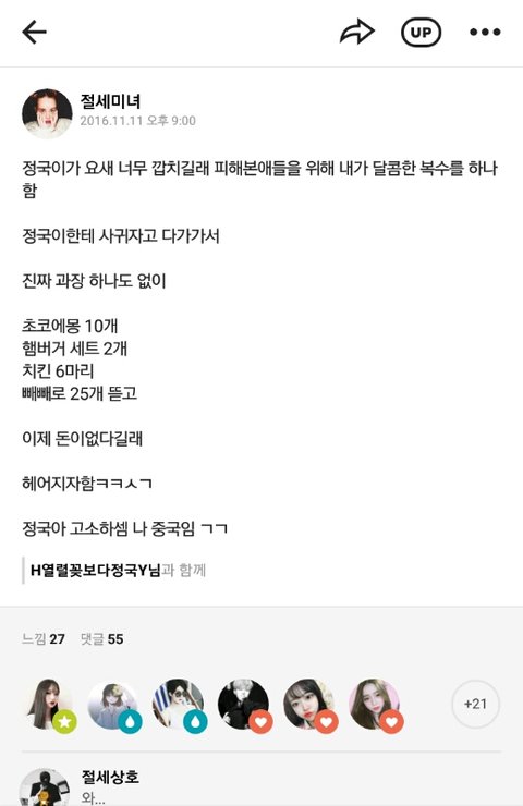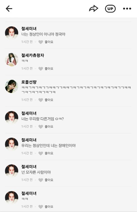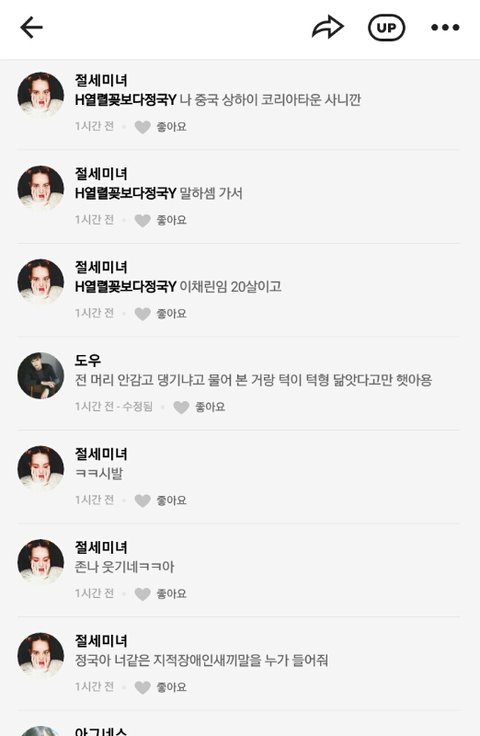 주민등록증을 •자기가 더 모자란 것 마냥• •자기는 이게 완벽한 계획인 줄 착각하면서• '나랑 사귈래?'이런 식으로 "열렬꽃보다정국"에게 다가가서 신상을 알아내더라군요... (그리고 그대로 유포) 정말 인상 제대로 찌푸려졌고 "아, 이 한심하고 띨띨해보이는 얘들이 우리나라의 학생이고 SNS를 벗어난 현실에선 얼마나 무식한 깡패새끼처럼 지내고 있을까... 참으로 암담하고 애잔하다 이를 어찌할꼬" 깊은 고민까지 빠졌었습니다. 그렇지만