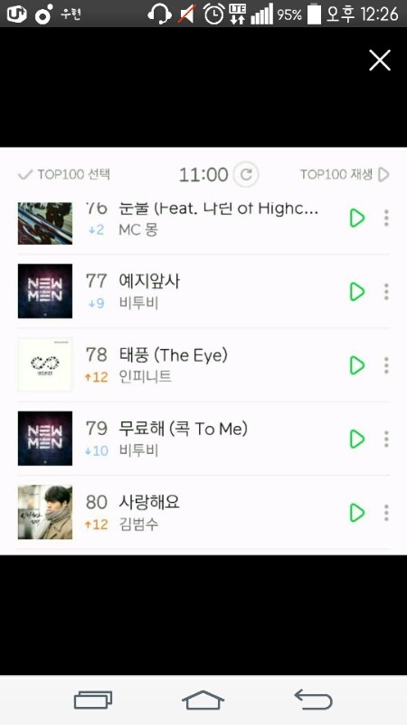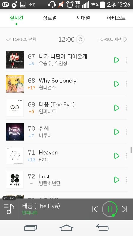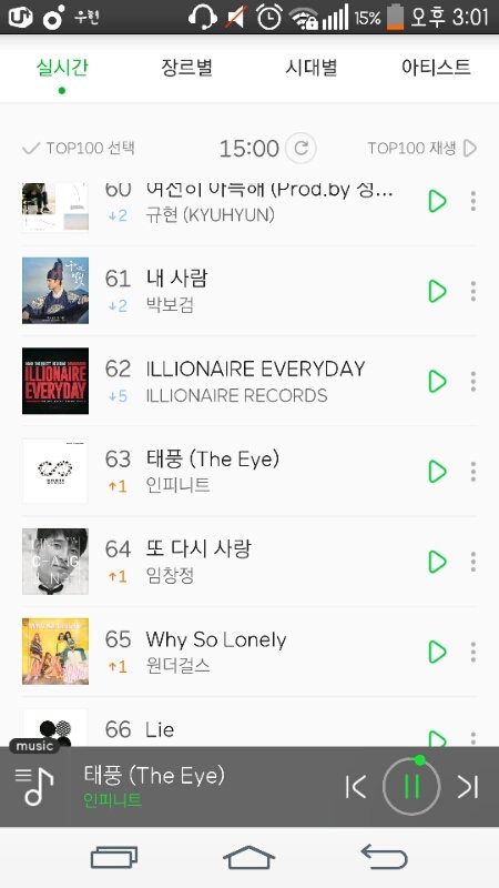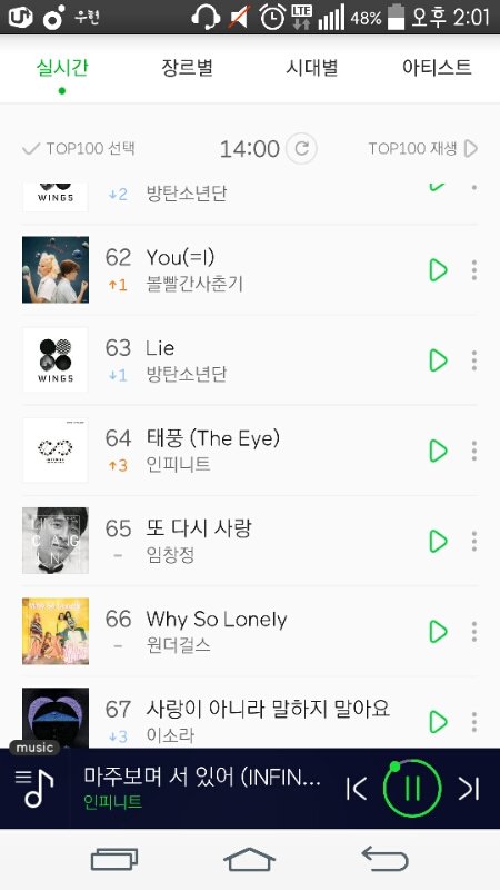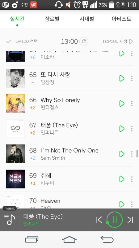 80~90맴돌았는데 딱 낮되니까 이렇게 잘올라 이만큼 사람들이 많이들어줘 인스피릿이 아닌 분들이 말이야..오랜만에 이런 곡을 내준 울림과 인피니트가 너무 고맙지않아?ㅠ난 너무 고맙고 도대체 얼마만에 이런 롱런인지 초반한달정도는 내가보고도 실감도 못했어 근데 이렇게 좋은 기회를 인슾이 뻥차버리는듯 90위를 오늘 처음으로 새벽1시에 찍었고 매일매일 같은시간 좀더 낮은순위로 떨어지고있어 즉 지금처럼 들어주는 머글없음 낮에도 90위찍고 80위대에서 놀고그럴거라는거지. 낮엔 잘오르니까 그래도 괜찮지 않아?라고 할수있는데 아니 새벽만되면 떨어지는 폭이 점점 커져가고있으니 오늘은 90위지만 내일,모레에는 더 아래로 떨어질수있어 거기다 신곡이라도 나와봐 그 순위에 신곡타격을 직빵으로 맞겠지? 그럼 더 떨어져 그렇게 100위까지 아슬하게 가 그러다 차트아웃해 그럼 또 우리는 낮에 이렇게 잠깐올랐다 새벽되면 차트아웃.이거 반복인거고 차트아웃 오래할수록 듣는 머글수도 확확줄거야 왜? 100위안에 안보이면 안찾아들어. 지금 뒷장에 있는것만으로도 한번 50뒤로 넘어가니까 앞장으로 다시 넘어오기 힘들지 차트아웃되면 다시 차트인하는것도 되게 더디고힘들어진다는거야