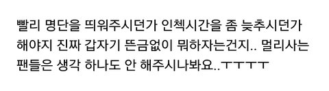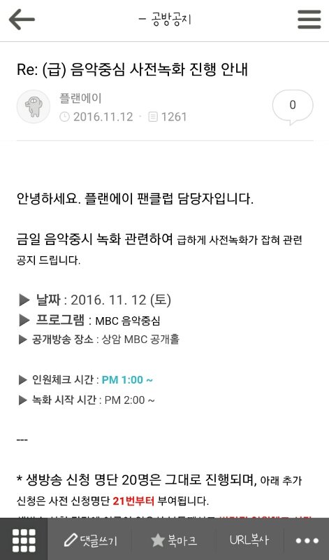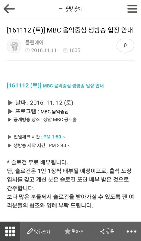 그리고 11시 30분에 추가신청을 받음. 그런데 참여명단 공지가 안올라옴. 그래서 추가신청한 팬들 참여명단 보지도 않고 일단 MBC로 감. 가는도중 인첵 15분 전에 참여명단이 뜸. 당연히 그중엔 자기 이름이 없는팬들도 있었음ㅋㅋ