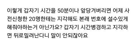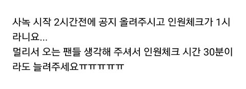 이렇게. 그래서 선착순 20명 안에 든 팬들 기뻐함. 그렇지만 뒷순서인 팬들은 잘릴까봐 걱정도 된다고 했었음. 그래서 사녹공지라도 올라오길 기대했지만 결국 그날 사녹공지는 올라오지 않고 지방에 거주하는 팬들은 인첵시간(1시50분)에 맞춰서 차표 예매