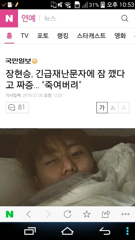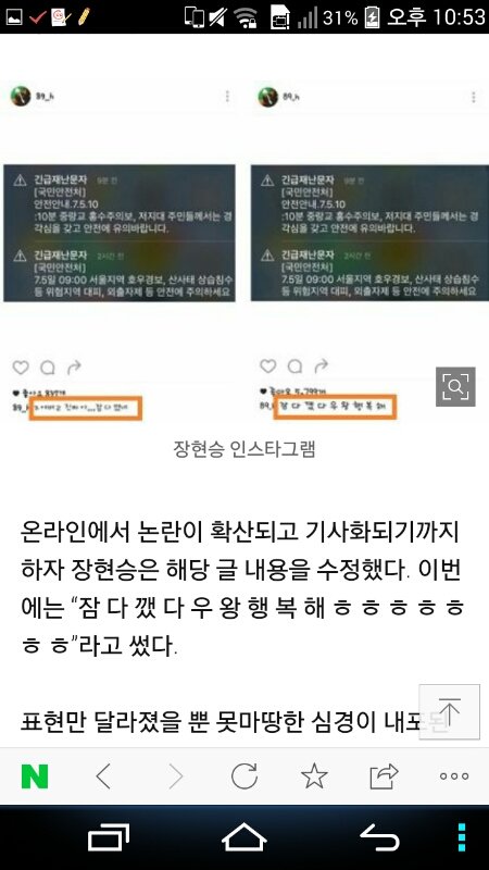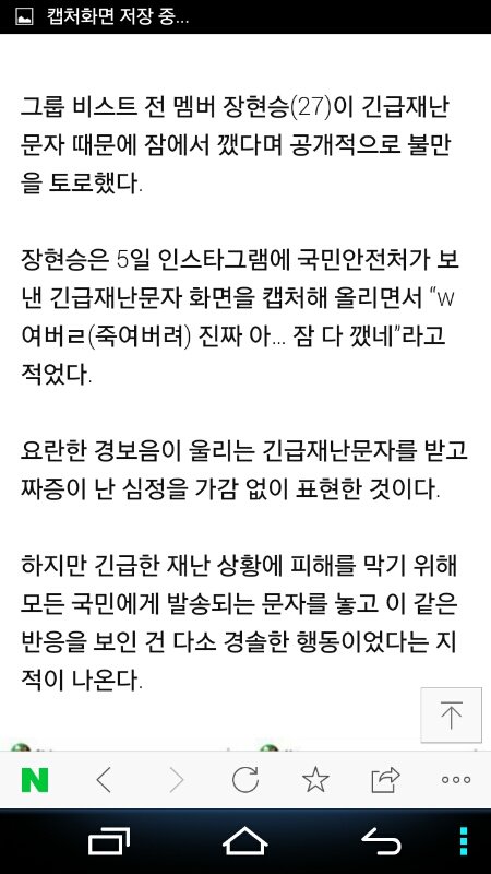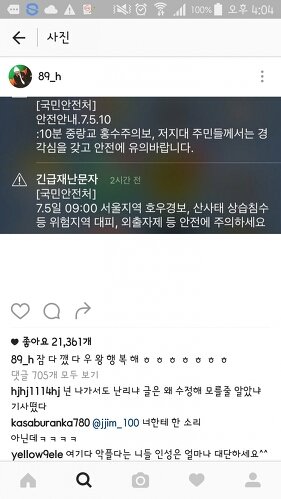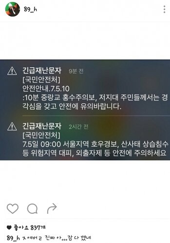 사진들보고 참 경솔하다 생각했음 긴급재난문자는 모든 국민의 안전을 위해서 발송되는건데 그걸가지고 죽여버리고싶다 짜증난다..이후엔 비꼬기 까지 에휴 예전에 팬들 쉴드치다 그만둔 이유가있네