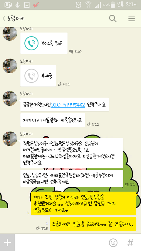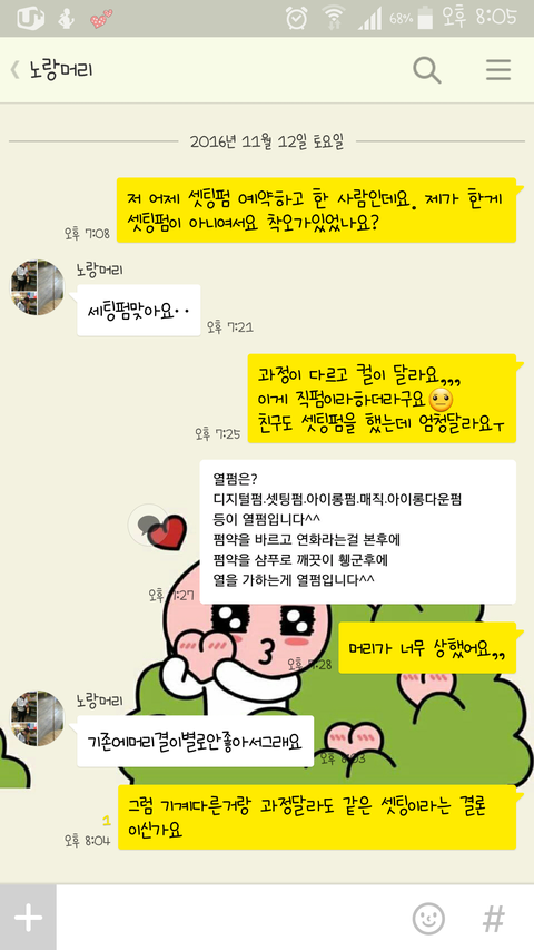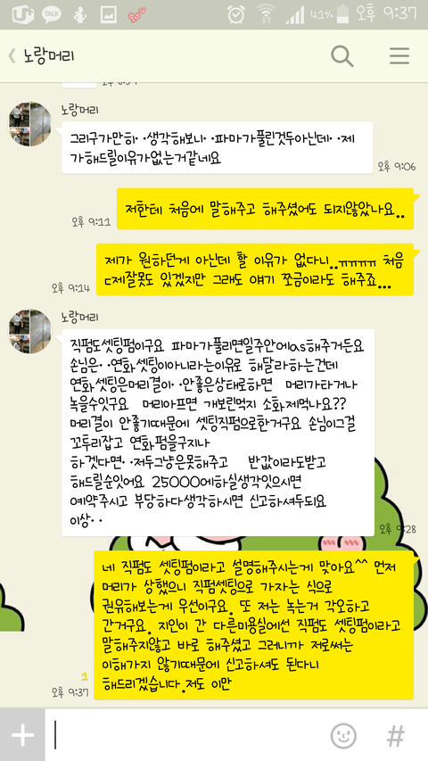 그래서 그것을 캡쳐하고 카톡으로 연락을 했더니 적반하장으로 머릿결이 그닥 안좋았는데 상할까봐 직펌쪽으로 진행했고 셋팅펌에도 셋팅직펌이 있다고 계속 그리말씀을 하셔서 다시 알아봤더니
