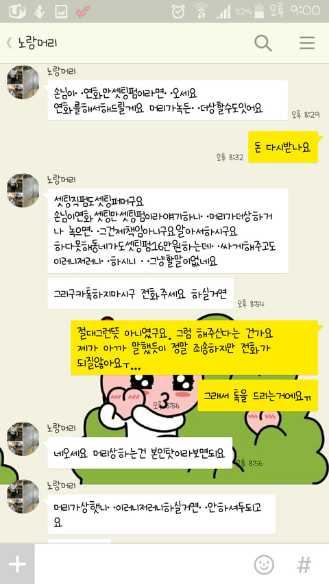 . 그것을 보여드렸더니 같은말을 반복하시고 오히려 차단한다며 비꼬는식으로 말을 해왔습니다. 또 동네미용실가면 16만원 주고 하는데 이렇게 싸게 받아놓고 이러니 저러니 하는건 이해할수없다며 할말이 없다는 식으로 저에게 분노를 표출 하였죠. 누가보면 제가 쓰레ki인줄 알겠어요 ㅋㅋ