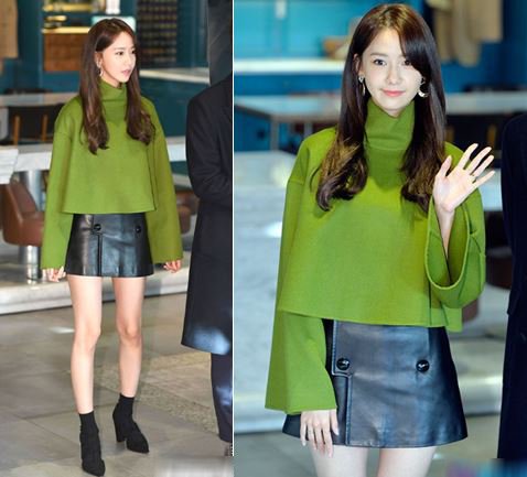 녹색 터틀넥에 레더 스커트입고 초식 사슴룩! 러블리행 ㅠ.ㅠ