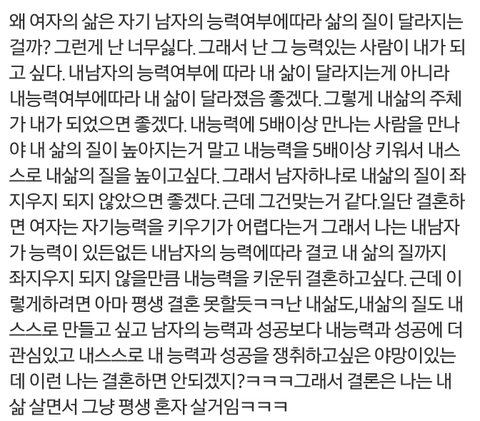 난 여잔데 솔직히 왜 맨날 남자의능력이 곧 내능력이되고 그게 내 행복을 결정짓는지 모르겠다