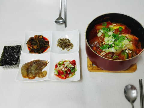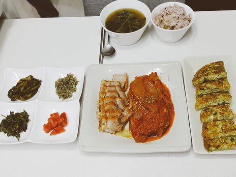 유부주머니 재료가 많이 남아 냉동실에 보관했다 댤갈풀어 전부치고 보쌈용 삼겹살넣어 묵은지찜 했구요^^