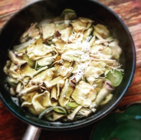 버섯이랑 야채들을 후라이팬에 물에 반쯤 잠기는 정도로