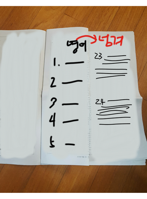 그런다음에 접은 페이지를 넘기면 이렇게 되는데 이렇게 하면 영어듣기를 하면서 동시에 문제를 풀 수 있어 1번부터 5번까지 들으면서 23번 24번을 푸는거야