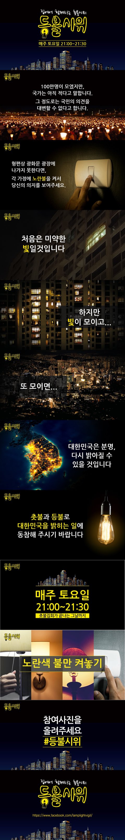 광화문 집회에 참가하지 못하는 사람들을 위한 등불시위 캠페인 입니다. 집에서라도 함께 동참할 수 있어 좋은 것 같습니다 :-) https://m.facebook.com/lamplightvigil/