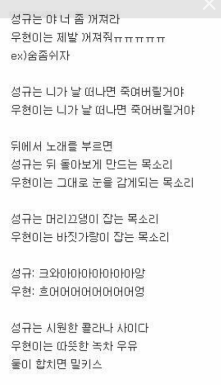 베댓에 자기전엔 우현 새벽엔 성규라는 말 처음 듣는데 너무 공감되고 쓰니=나 라서 헙.. 했음ㅋㅋ 마지막은 성규 우현 노래부르는 투샷