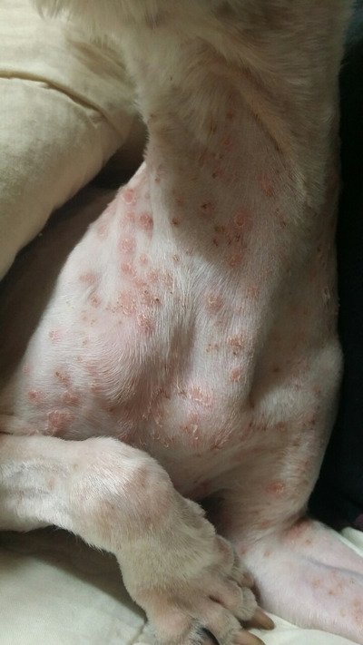 전신 세균성 피부병 감염으로 온몸에 붉은 반점이 도드라짐.