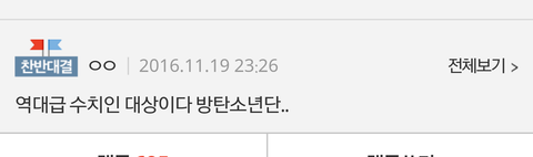 진짜 이글보면 너네 아무생각 안드냐..내가수였으면 진짜 엄청 열받아 미쳐버리겠는데 너네만 안보고 무시하면 끝이아니야 저말은 곧 방탄이 노력도 안하고 받은것처럼 해버리잖아..몇몇사람들은 저렇게 믿어. 진짜 나도 축하해주려다 저런글이 많아서 놀랬다. 해명을 하라는게 아니라 사실을 올려놓든 댓글을 선점하든 해야하지 않을까...
