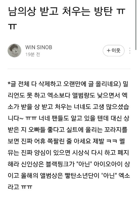 이쪽 커뮤에 타 연예인들 비방글 박제가 자주 올라오는데 우리가 그런 비방글 쓰는 애들 보면서 좀 안 좋게 생각하고 그러거든... 입 함부로 터는 애들 싹 망했으면 좋겠다고 생각하고 있었는데 까이던 연예인들 중 너네가 고소한다고 들어서 잘 됐다고 생각하고 있어 꼭 입 막 털던 애들 전부 빨간 줄 그었으면 좋겠다 아 그리고 대상 축하해!!