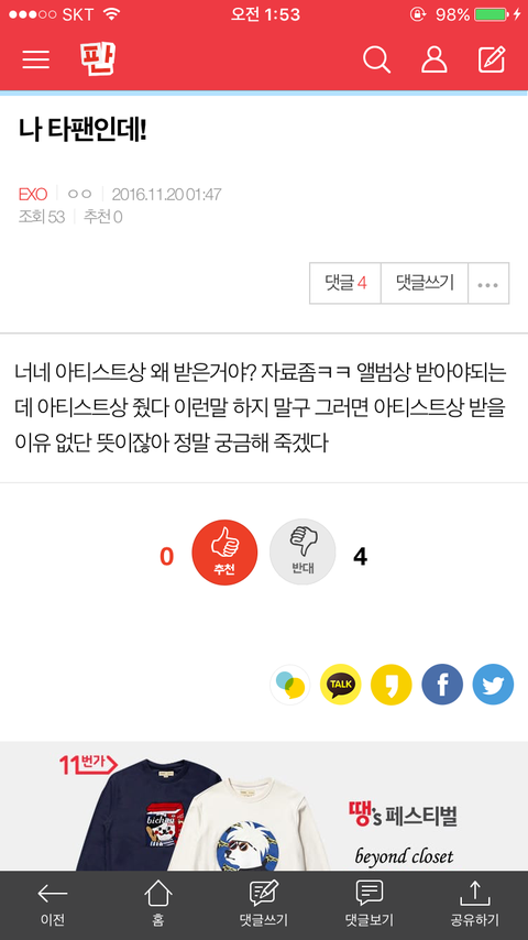 타팬인데 엑소대상못받아서 빡친 핫트알바생 너무 웃프다..