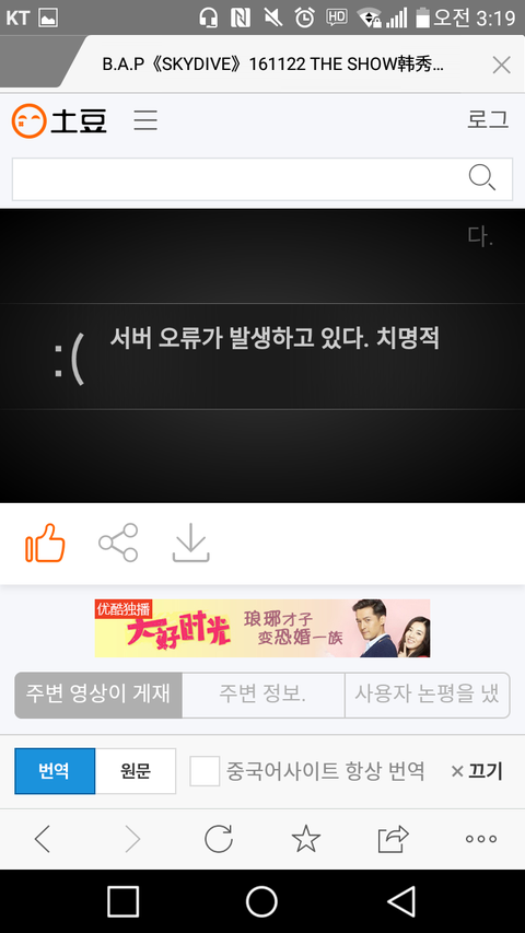 토도우 순위도 보고 스밍도 할 겸 해서 갔더니 뮤비를 끝나는 부분만 보여주네ㅋㅋ..? 나만 이런진 모르겠는데 뭔 서버오류도 뜨고..