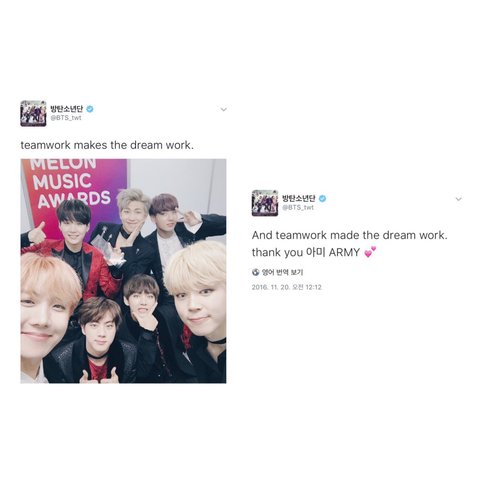 그냥 모두한테 고맙다고 말해주고 싶어.. 솔직히 우리 열심히 해왔잖아 방탄과 같은 목표를 갖고 같은 길을 걸으면서 방탄이나 우리나 힘들었을텐데 서로 응원해주고 아껴주고 그렇게 우리가 여기까지 온 것 같아 내가 말한 "여기까지"는 우리가 이룬 그 목표, 바로 대상을 말한거야. 앨범 대상도 타고, 우리 얘들 진짜 너무 성공한 것 같다 그치 ? '방탄' 이라고 말하면 사람들이 누군지 몰랐던, 그 때부터 나는 방탄을 좋아해왔고, 그 때부터 나는 아미였기에 지금 모든 것이 너무 벅차고 고맙고 또 고마워. 방탄이 없었으면 아미도 없었겠지만 또 아미가 없었으면 방탄도 없었어. 우리 대상타고 실트에도 뜨고, 우리 더 열심히 스밍도 돌려서 지금 현 순위로 피 땀 눈물이 3위, 둘,셋이 11위, ... 그리고 심지어 Interlude: Wings 랑 Cypher 4도 차트 인 했어..! 안자고 있는 아미들, 자다 깬 아미들, 긴 글 읽어줘서 고맙고 나도 아미이지만 나는 너희가 있어줘서 고맙고, 우리가 있어줘서 고마워. 사랑해