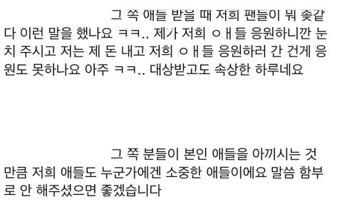 우리가 이런 일을 했다면 분명히 피드백하라고 사과문 쓰라고 실트 올라가고 톡선 올라가고 온갖 팬덤한테 욕 다먹을텐데 우리도 사과 좀 받자 이 일 해결 되면 우리도 이거 사과문 받고싶어