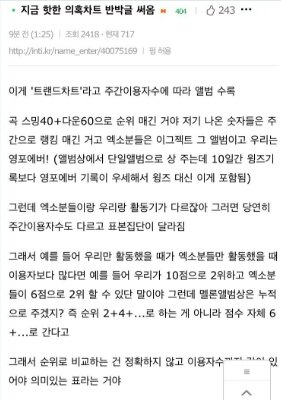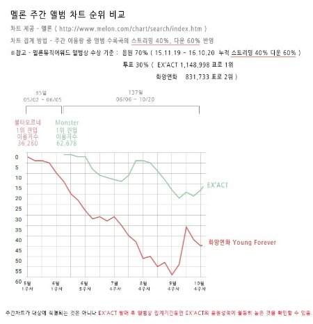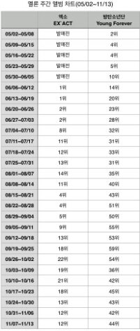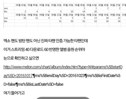 이에 대한 반박을 해보겠음. 저 표를 보면 05/06~11/13 이 기간동안에는 이그잭트 앨범과 영포에버 앨범이 매주 함께 순위에 올라있음. 그런데 이 기간동안의 모든 주별 순위가 방탄소년단보다 엑소가 높음. 이용자도 같고, 이용자의 수도 같은 상황에서 5개월이 넘는 기간동안 엑소가 방탄소년단보다 높은 순위에 있었고, 5개월간 더 높은 점수를 받았음을 알 수 있음. 또한 이 기간동안에는 순위 차이가 30위 이상 차이가 났음. 설사 방탄소년단이 5월에 높은 점수를 가져갔다 하더라도 그건 한달 뿐이고 남은 5개월간의 누적차이는 절대 무시할 수 없는 수치임.