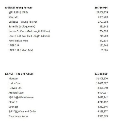 이를 보면 점수가 거의 두배 이상 차이난다는 것을 알 수 있음. 멜론만 집계된 것이 아니라 모든 음원사이트 총합이라 약간의 오차는 있을 수 있으나, 사람들이 멜론을 제외한 타 음원 사이트에서만 엑소 노래를 듣지 않은 이상은 이 표가 멜론의 성적과 크게 다르지 않아보임. 오히려 멜론과 어느 정도 정비례하다고 봐도 만무함. 대충 성적 차이가 어느정도인지 참고용으로 가져온 캡쳐니 의미부여하고 연연하진 말 것.