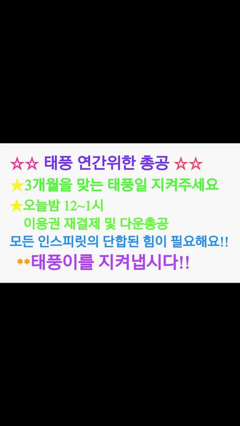 태풍이 3개월맞이 총공떴어!! 타돌 음원도 나오니까 꼭 참여해서 태풍 올려주자..자칫하면 1시에 챁아웃 할수도 있으니 인스피릿이라면 꼭 재결제하고 다 참여하자