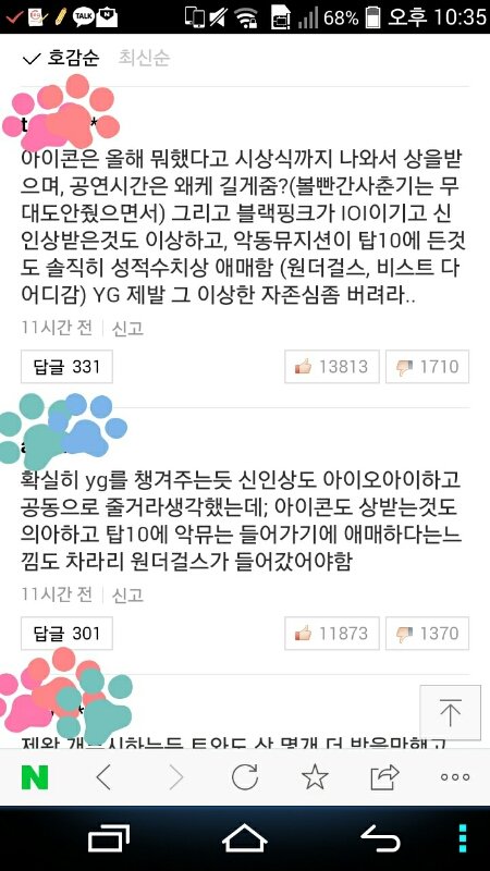 진짜 초록창 댓글보는데 너무 화나더라...솔직히 코니들 이번년도에 해외에서는 진짜 열일했잖아...까는인간들 진짜 무슨 상받았는지 어떤게 심사기준인지 알지도 못하면서 국내활동 좀 없었다고 까고...심지어 어제 어떤 타팬들은 왜 쟤네가 아시아스타냐고 까더라....본인들이 투표하던가..에휴ㅠㅠㅠ너무 짜증나...더리믹스도 그렇고 참 열심히 1년 보냈을텐데...홍보도 전혀 없고 그러니까 사람들 모르고 막 까고...에휴ㅠㅠ