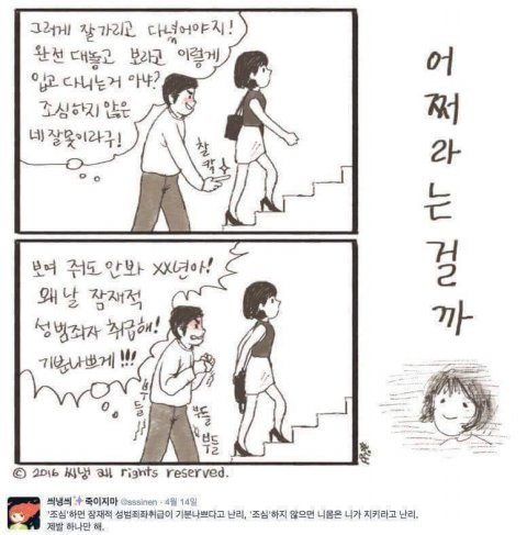 난 치마 입고 계단이나 에스컬레이터 올라갈때 뒤에 가린다고 욕들하는 사람들이 많은거 같아서 그냥 안 가려. 물론 속바지를 항상 여름에도 입어서 만약 보여도 상관없게 해서 딱히 신경 안써 속옷이나 맨살을 직접 보여주는건 아니니까.... 속바지야 뭐 아이돌이나 댄스팀들만해도 그냥 자연스럽게 보이는 옷처럼 된지 오래됐잖아. 판에 보면 내몸 보이는게 싫어서 가린다 이런 얘기들이 보이는데 쳐다보는 남자놈들이 잘못된거지 치마입은 내가 잘못된건 아니니까 좀 당당해져도 되지않나 생각하는데 내가 너무 개방적인거야?...