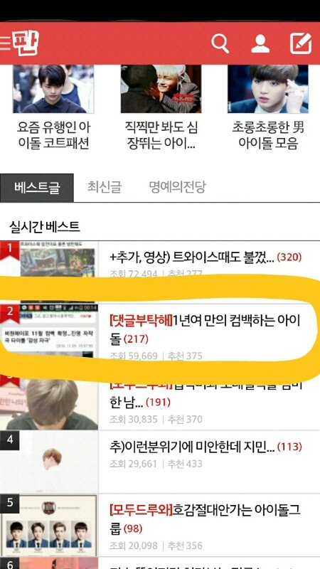 지금 엔터톡에 비원에이포 홍보글이 어제 티저뜬 시간 부터 지금 까지 상위권에서 왔다갔다거리고있는데 내 개인적인 바람이지만 컴백전까지 이글이 상위권에 머물었으면 좋겠어 소속사가 홍보를 안시켜줘서 컴백을 하는지도 모르는 사람이 많고 아직 추천안누른사람 누르고 댓글싸줬으면 좋겠고 가끔들어가서 댓글좀써줘!이런거라도 해주고싶다