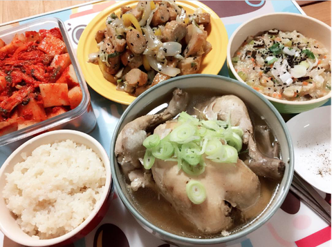 삼계탕이에요. 요즘 피곤해하는 신랑을위한 나름 보양식이네요ㅎㅎ 어묵볶음이랑 닭죽은 아들꺼^^
